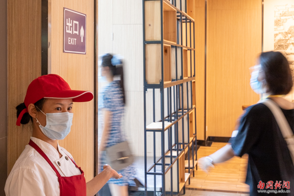 踩过消毒地毯进行鞋底消毒(谢丰 摄)