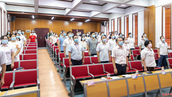 庆祝大会在庄严的国歌声中拉开帷幕。全体肃立,由王心洁副校长领誓,全体党员身戴党徽,举起右手、握紧拳头,重温入党誓词。