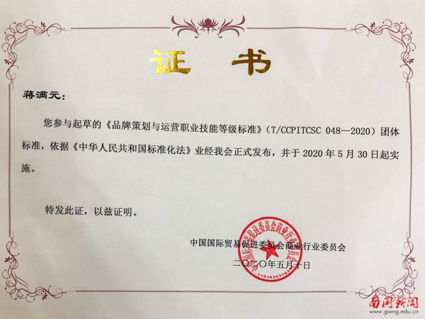 本网讯 我校作为起草单位参与起草的《品牌策划与运营职业技能等级标准》团体标准(T/CCPITCSC 048——2020),依据《中华人民共和国标准法》,经审批同意,于2020年5月30日起正式发布实施。