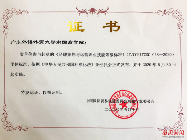 此次,我校参与起草的《品牌策划与运营职业技能等级标准》获准发布实施,实现了我校教师参与国家行业标准起草,与正式发布实施工作的“零”突破,凸显了我校科研在服务区域社会经济发展能力的有效提升,既体现了我校此方面研究能力的明显增强,也为学校更好地服务国家的“一带一路”战略、“粤港澳大湾区”战略及广东自由贸易区发展战略提供了强有力的支撑。