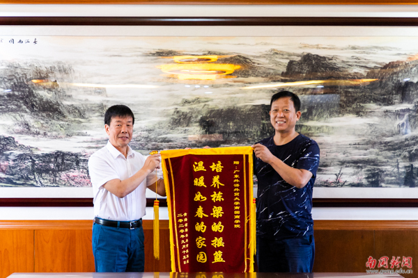 2020年的9月,一位来自青海省海西蒙古族藏族格尔木市郭勒木德镇的学生家长跨越3300公里,来到南国校园。他带了一面写着“培养栋梁的摇篮 温暖如春的家园”的锦旗,送到王华校长的手中,感激学校对孩子的悉心教育、培养。