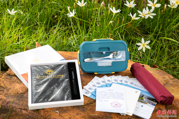 在 “绿色通道”的教室里,映入眼帘的就是桌面上整齐摆放着的“开学大礼包”。其中有学校特别定制的纪念笔记本、钢笔、贺卡和雨伞等物品。除此之外,还有一个精美的饭盒。学生资助中心的余小玲老师告诉记者,考虑到今年疫情的原因,学校提倡学生自带餐具用餐,因此贴心地为同学们准备了饭盒。2020级刘同学与记者分享道:“收到礼物时,既惊喜又开心。在办理手续时,老师们都很耐心地帮助我,让我感受到了南国大家庭的温暖。”