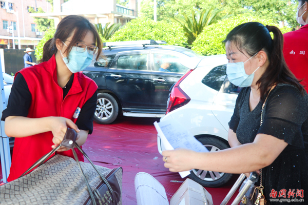 来自2019级中国语言文学类专业的黄雨婷同学在接送完同学后,才有空停下来擦拭额前的汗水。“今天我主要负责接送新生至报到注册的教室。”作为一名大二学生,她感慨:“去年报到的时候,也是师兄师姐为我提供服务,所以今年我也成为了志愿者中的一员。看着师弟师妹们仿佛看到了一年前懵懂的自己,眼里满是对大学生活的期待。”
