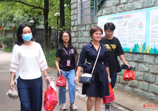 独在异乡为异客,每逢佳节倍思亲。西方语言文化学院辅导员黄卫、教务秘书江玲担心同学们未能适应独自在学校的生活,放弃了与家人一起团聚的时间,到学生宿舍走访慰问、送月饼。在交流过程中,师生关系轻松和谐,黄卫希望同学们能够尽快融入校园生活,习惯广州的气候和生活习惯。“更重要的是,要提前做好职业生涯,利用大学四年的时光好好充实自己。疫情期间一定要注意卫生,做好防护工作。”他们暖心叮咛。