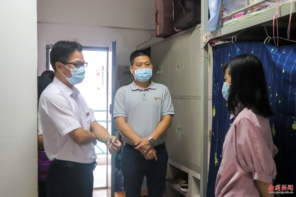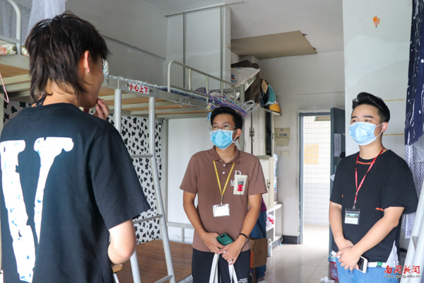 党委书记许志超(左)、学生处处长卢少勇走访学生宿舍(章悦 摄)