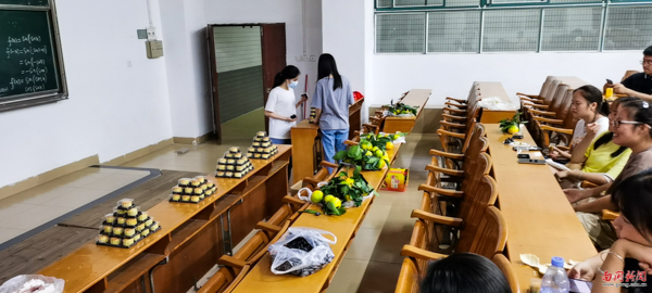 一个红色的袋子,里面装着学校自制的月饼,还有经济学院老师们精心挑选的橘子、香蕉、柚子、冬枣、葡萄等水果,满满的爱传递到了学生手中。国庆、中秋当天,经济学院党总支书记黄汉成、团委书记李惠良等老师来到学生宿舍,为留校过中秋的同学送上了暖心的祝福。当天晚上,经济学院组织留校过节的同学在教室里收看中秋晚会,一起度过了一个愉快的节日。