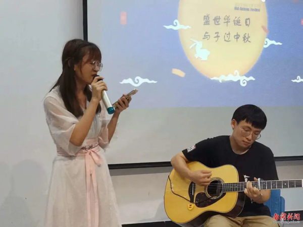 一首中西合璧的弹唱《看月亮爬上来》拉开了活动的帷幕。同学们通过“击鼓传花”的游戏上台分享自己家乡的中秋节习俗、美食,或者表演节目,给现场观众带来听觉盛宴的同时,也让人回忆起家乡的味道。来自2017级英语3班的胡羽翀同学带来的一首《但愿人长久》,更是为大家送上了阖家幸福安康的节日祝福。