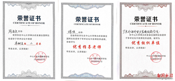 本网讯 近日,首届全国阿拉伯语学子学术论坛在线上举行,我校东方语言学院阿拉伯语专业学生周海贝荣获(本科生组)二等奖,张瑶老师获优秀指导老师奖,南国商学院荣获优秀组织单位奖。