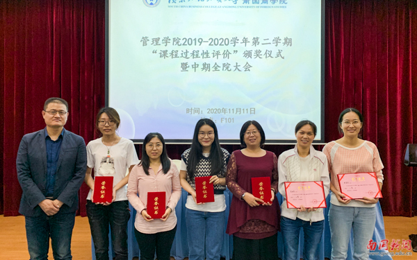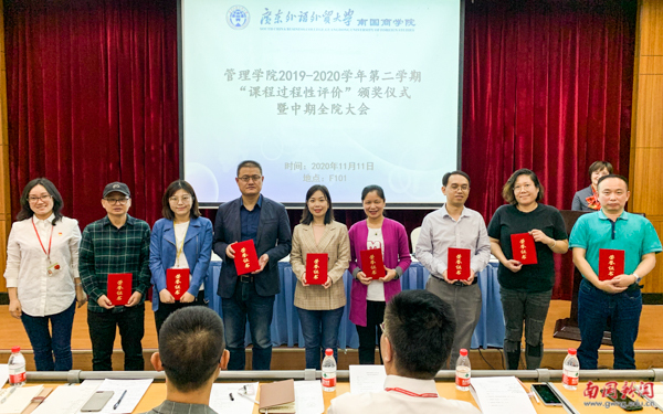 本网讯 近日,管理学院举办课程过程性评价经验交流及颁奖仪式。本次活动旨在贯彻落实《教育部关于加快建设高水平本科教育全面提高人才培养能力的意见》(教高[2018]2号)及《广东外语外贸大学南国商学院课程过程性评价实施方案》(南国[2020]60号)等文件精神,加强学习的过程管理,完善过程性评价体系,深化信息化教育教学改革。赵副校长出席会议,学院全体教职工参会。会议由管理学院副院长文佑云主持。