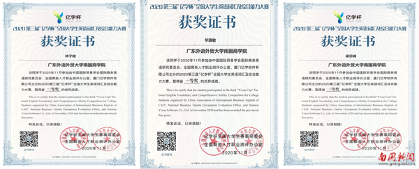 本网讯 近日,第三届“亿学杯”全国大学生英语词汇及综合能力大赛落下帷幕。全体参赛选手的前5%获最高等奖项一等奖,我校英语语言文化学院学生表现突出,9人以优异的成绩荣获一等奖。其中2018级翻译专业的范冰冰、王淳亮2名同学进入前全省100强,分别是第59名和94名。