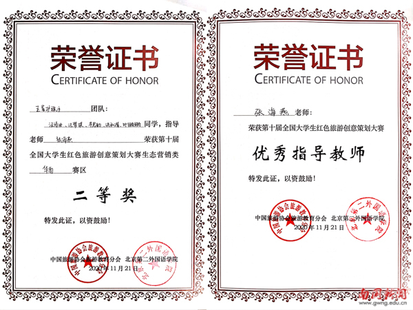 本网讯 近日,第十届全国大学生红色旅游创意策划大赛圆满落幕。我校学生表现优异,由2019级旅游管理类专业的叶珊珊、汪诗汝、汪梦琪、洪和谐和中国语言文学类专业的毕思韵组成的“五星护旗手”团队荣获得华南赛区二等奖,旅游学院的张海燕老师获“优秀指导教师”称号。