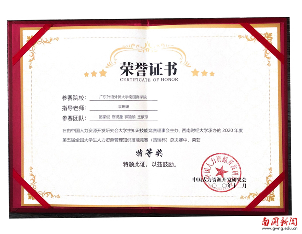 本网讯 近日,第五届“踏瑞杯”全国大学生人力资源管理知识技能竞赛总决赛在线上顺利举办。我校管理学院2018级人力资源管理专业学生彭家俊、陈锐濠、王依琼、钟颖颀组成的学生团队,在本次全国人力资源管理知识技能竞赛总决赛中荣获特等奖。