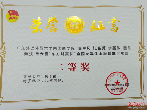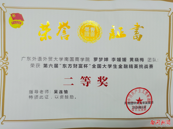本网讯12月18日下午,由共青团中央青年发展部主办,东方财富信息股份公司、全国学校共青团研究中心承办的第六届“东方财富杯”全国大学生金融精英挑战赛总结颁奖会落下帷幕。经过校赛、省赛、国赛的激烈比拼,我校经济学院派出的参赛队伍脱颖而出,荣获国赛二等奖2项。