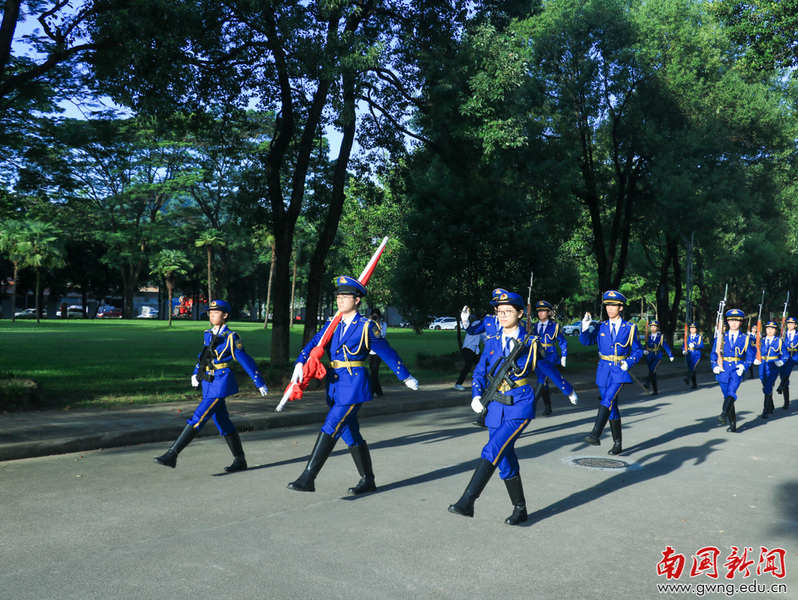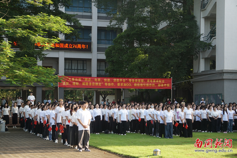 本网讯 为庆祝中华人民共和国成立76周年,我校于9月29日清晨在C栋教学楼前广场举行国庆升旗仪式。校团委书记王黎明,部分学院党总支书记、直属党支部书记,各学院团委书记,校团委全体老师与部分辅导员老师,以及学生干部、学生代表共同参加本次活动。仪式中,全体青年学子庄严举起右拳,以“请党放心,强国有我!请祖国放心,复兴有我!”的铮铮誓言,表达坚定理想信念、勇担时代使命的青春决心,展现了南国学子深厚的家国情怀与奋发有为的精神风貌。