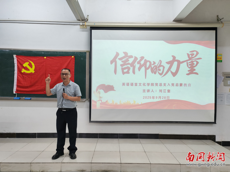 本网讯 为了深入学习贯彻习近平新时代中国特色社会主义思想,加强青年学生思想政治引领,筑牢学院党建育人根基,助力2025级新生深刻把握党的初心使命,点燃其向党组织靠拢的理想火种,9月28日晚,英文学院于G403教室举办“信仰的力量”新生入党启蒙教育。本次讲座由学院第二党支部书记刘江奎主持,为青年学子扣好“思想入党”的第一粒扣子。