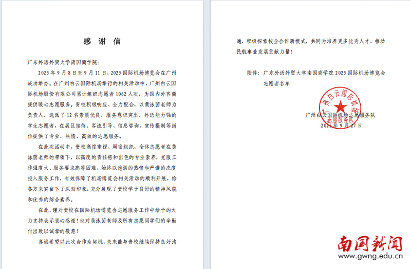 本网讯 近日,我校收到来自广州白云国际机场志愿服务队的感谢信与“2025国际机场博览会最佳合作单位”牌匾。这既是对文化与传播学院志愿者团队历时近半年、全程深度参与博览会服务的嘉奖,也是对我校实践育人与组织协调工作的充分肯定。