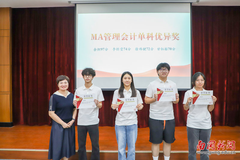 颁奖典礼中,管理学院执行院长文佑云教授为2024级ACCA创新班教学中做出突出贡献的优秀教师郭静老师颁奖,并为余炟等优秀同学颁发荣誉证书。据悉,在ACCA全球考试中,2024级ACCA创新班MA管理会计科目的通过率达52%,FA财务会计科目的通过率达57%,这充分体现了该班的办学成果。
