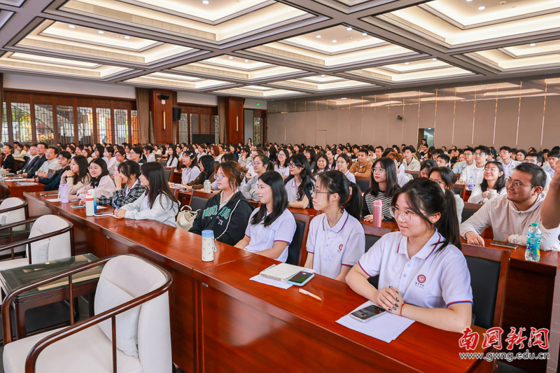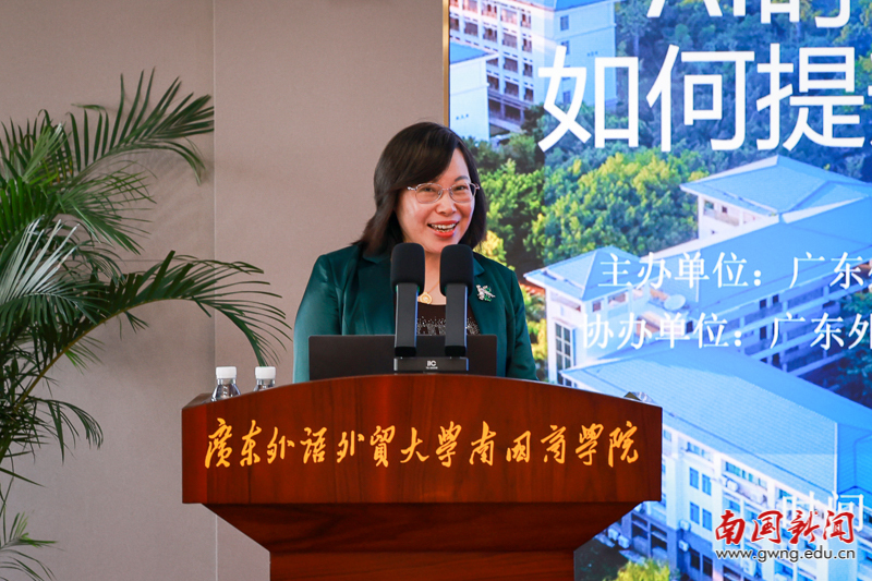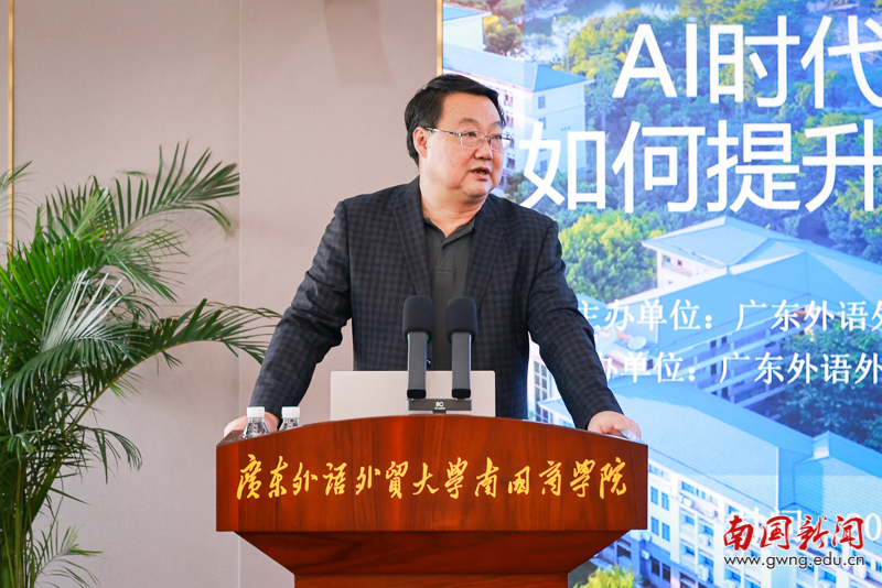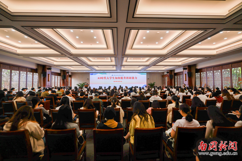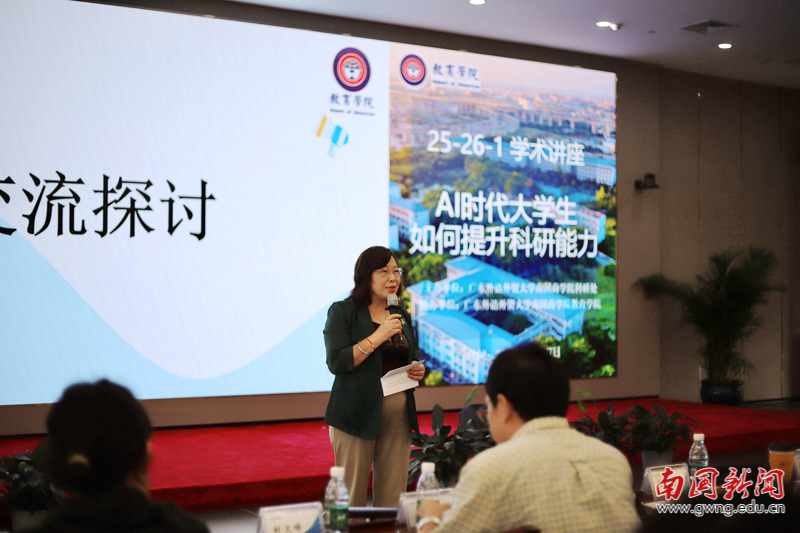 本网讯 10月27日10时,由广外南国科研处主办、广外南国教育学院协办的学术讲座“AI 时代大学生如何提升科研能力”在多语种大楼国际学术报告厅举行。本次讲座主讲人为人民教育出版社报刊社总编辑、郭戈教授,主持人为教育学院副院长肖建芳教授;参会人员包括华南师范大学教育科学学院马早明教授、华南师范大学在读博士生蔡静婷、广外南国教育学院科研处处长吴新玲、科研处平台管理科副科长张懿、广外南国商学院教育学院院长冯增俊教授、教育学院党总支书记梁立为、教育学院王进军教授、郑圆皓博士以及对该讲座深感兴趣的莘莘学子;现场座无虚席,学术交流氛围浓厚。