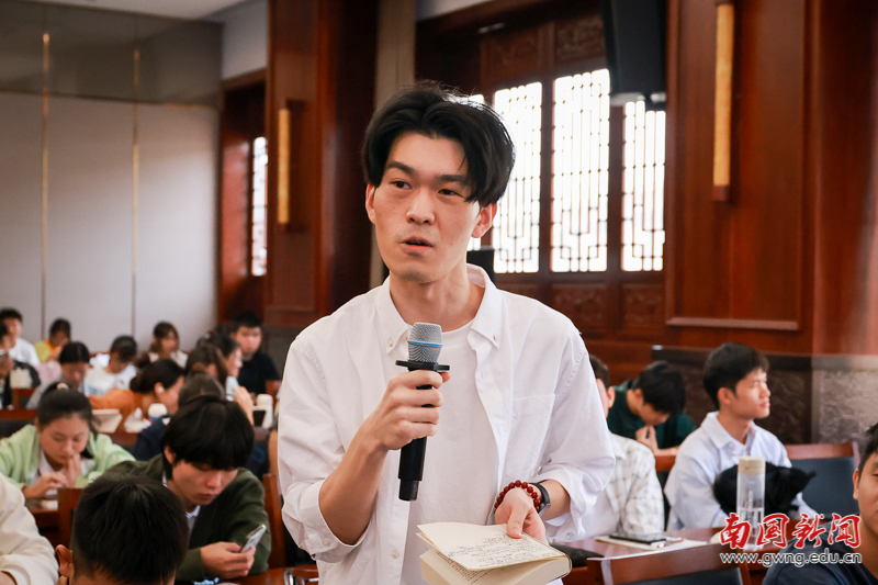 在交流探讨环节,现场气氛活跃。同学们就跨文化研究的方法、AI写作的查重规避、如何在文献中推陈出新等具体问题踊跃提问。郭教授一一给予了细致解答,他建议学术研究要“瞄准靶心,逐渐聚焦”,鼓励大家深入思考,勇于实践。与郭教授的对话更让大家更清晰地认识到,当代大学生要善于在智能革命中找到属于自己的“C位”;选择所爱,热爱所选。
