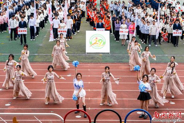 本网讯 11月13日上午,我校田径运动场上欢呼声与音乐声交织,第二十九届运动会开幕式正式启幕。党委书记许志超,副校长赵福春、陈林汉、王关义,学校第29届运动会组委会全体成员及全校师生共同出席开幕式。17支代表队方阵依次登场,多个方阵的表演让人眼前一亮:管理学院醒狮团开场造势,扇舞与舞剑行云流水、刚柔并济;文传学院伴《水调歌头》展团扇雅韵,转场啦啦操迸发活力;经济学院手势舞“种”出绿芽红花,复刻生命生长力量;教育学院踏竹竿“开合”节律跳民族舞蹈,传承文化根脉显民族自信;东语学院情景演绎百年历史节点,传递青年担当。