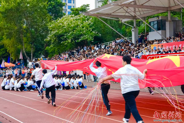 国际学院方阵汇聚多国学子,一场红蓝交织的花球舞,彰显国际文化交流的活力与开放,更是体现青春无国界,梦想共此时。