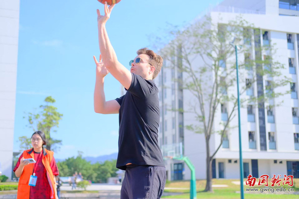 “Well, I'm having a really good time!”来自大学英语教学部的美国外教Lucien参加了4×100米混合接力和定点投篮等项目。他激动地说,许多学生都抢着和他拍照并送上鼓励,这次校运会让他仿佛回到了高中时光。Lucien表示,“参加体育项目就是与自己对抗的过程,不要害怕失败,try again就好”。同样来自大学英语教学部的美籍外教Ryan虽在定点投篮中未发挥最佳,却为队友的出色表现由衷欣喜。他分享道,专注过程而非结果能有效缓解紧张,这一心得同样适用于生活与工作。明年我会再来,投进每一个球!Ryan笑着比出胜利手势,期待来年再创佳绩。