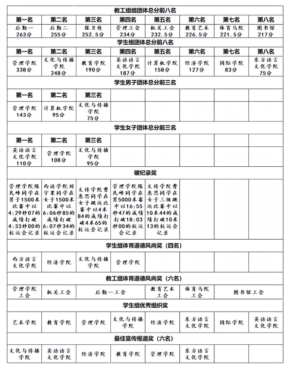 本届运动会圆满落幕,管理学院以338分的总成绩成功卫冕学生组团体冠军,文化与传播学院和教育学院分列二、三名。本届赛事竞技水平突出,陈民峰、刘宇果、曹惠思等多位运动员刷新了校运会纪录,展现出卓越的运动风采。(记者:李佳文 王艳霞 李思漫 肖婷 卢洁 黄宝仪 袁子鸽 实习记者:彭斯敏 林忆忆 田诗源 黄子蓉 陈怡欣 钟嘉仪 盘筱瑜 李瑶 许素素 董怡娟 林梓洋 刘思榆)