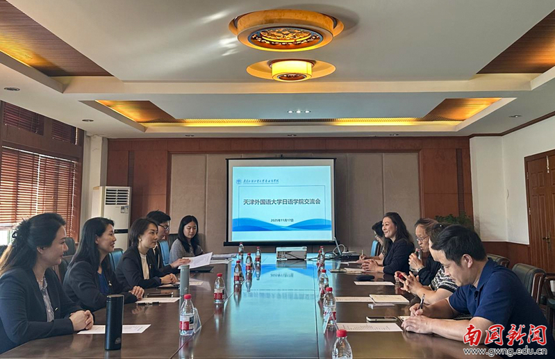 本网讯 11月17日下午,天津外国语大学日语学院院长席娜、副院长赵冬茜、党委副书记金福春、辅导员凌震埼一行访问我校,与我校东语学院院长池圣女、党总支书记谢丹平、副院长吴丽、许静华,日语国一流专业建设点负责人李爱文、日语系主任曹美兰等院领导共同开展日语学科改革专题研讨。本次交流聚焦人才培养模式创新,特别为我校有考研意向学生提供精准升学指导,标志着两校合作进入新阶段。