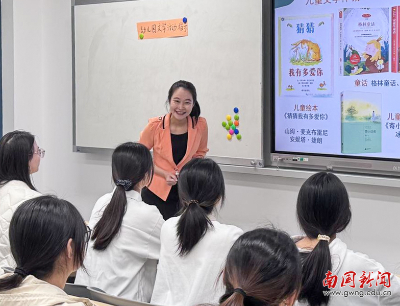 陈智秀老师围绕文学教育活动设计展开教学,语音语调抑扬顿挫,手势语言恰到好处,通过言传身教引导学生体会故事演绎中的角色定位与情节感知。在诗歌朗诵环节,她带领学生以手势舞形式互动演绎儿童诗歌,让学生在韵律与意趣中感受文字之美。