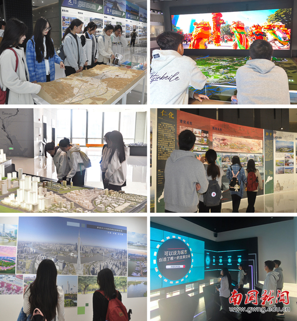 广州市城市规划展览中心作为彰显广州城市魅力的核心窗口,系统串联起城市从千年商都到现代化都市的发展脉络,是展现规划成果与地域文化的重要平台。师生们首先踏入“千年商都·城市脉络”展区,贯穿长廊的动态时间轴墙播放的《广州·生长的天际线》主题短片,清晰呈现从南越国到粤港澳大湾区的发展历程;随后在二层核心展示区,通过老城区复原沙盘、全息影像剧场及沙盘动态演示等,深入了解历史城区保护、骑楼活化等规划实践,展厅西侧文创体验区的古建筑拼装模型更展现了建筑文化的传承创新。拾级而上来到三楼环形平台,巨型城市沙盘在LED矩阵照耀下铺展,“黄金三角”岸线、各大产业集聚区错落其间,3D全息投影立体呈现交通与生态布局,让大家直观感受四中全会高质量发展部署在广州的实践落地。
