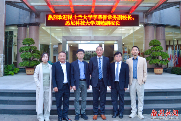 本网讯 11月22日下午,澳大利亚昆士兰大学常务副校长李荣誉、悉尼科技大学副校长刘勉一行来访我校。三方举行高层工作会议,共商深化“2+2”项目合作。会谈聚焦师生互访与课程衔接等核心议题,并达成多项共识。我校副校长陈林汉、赖志立以及国际合作与交流处相关负责人参与交流活动。