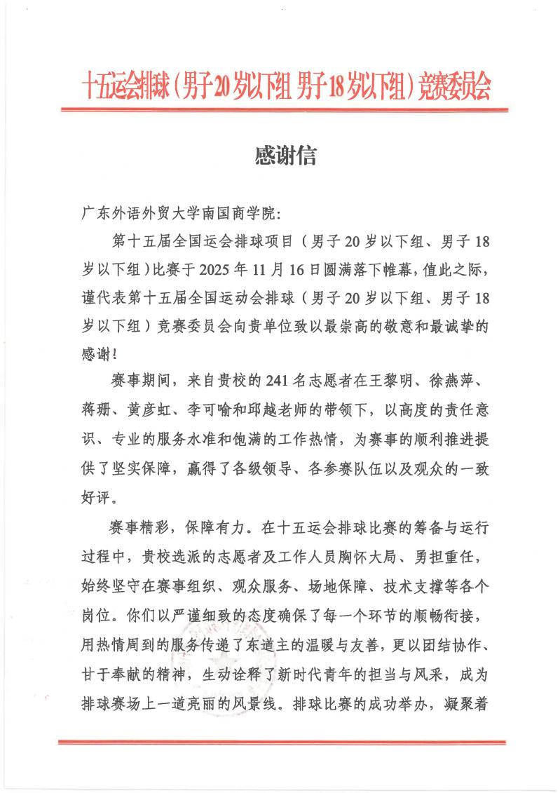 本网讯 近日,我校收到第十五届全国运动会排球(男子20岁以下组、男子18岁以下组)竞赛委员会发来的感谢信,对学校在赛事期间组织志愿者提供的卓越服务表示高度认可与衷心感谢。信中指出,在我校王黎明、徐燕萍、蒋珊、黄彦虹、李可喻、邱越等教师带领下,241名学生志愿者以高度的责任意识、专业的服务水准和饱满的工作热情为赛事顺利推进提供了坚实保障,赢得各方的一致好评,充分展现南国师生的担当与风采。