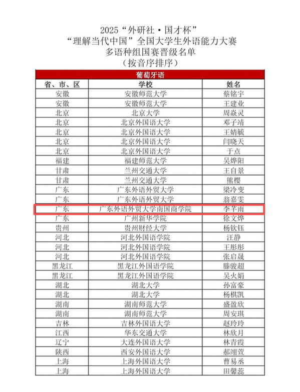 在近日落下帷幕的“外研社·国才杯”全国外语能力大赛中,我校2024级葡语专业李芊雨同学凭卓越的双语能力在赛场上大放异彩,荣获省赛英语综合能力组金奖、葡语组银奖以及英语演讲组铜奖。作为今年英语赛道唯一晋级选手和小语种组唯一晋级选手,成功进军国赛,最终斩获英语与葡语两项国赛铜奖,成为我校在该赛事中双赛道获奖的第一人。这位以语言为刃的文化“跨界先锋”,其成功离不开学校双语教学体系的系统性支撑。