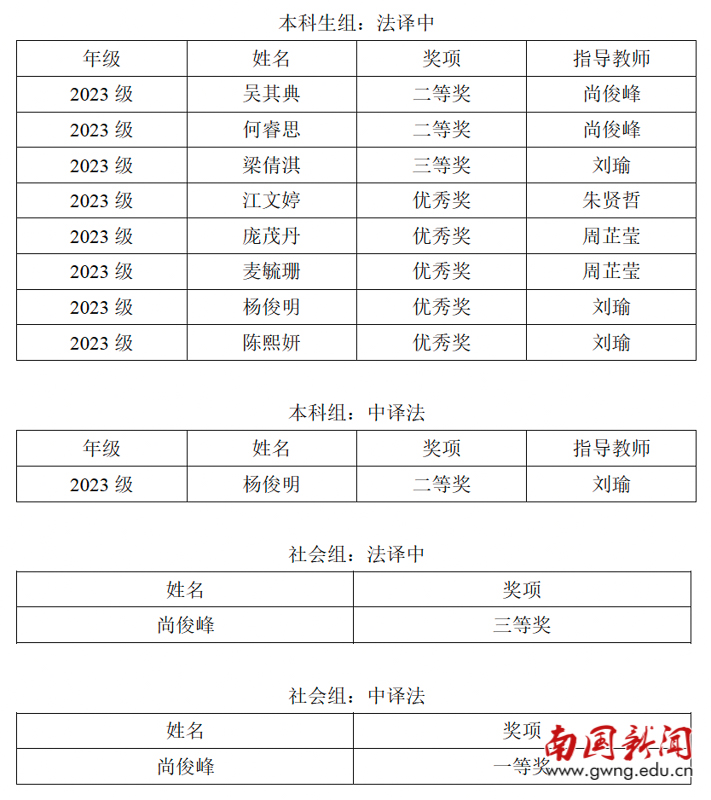 我校法语系历来重视学生的专业学习与实践,始终鼓励学生参与校内外各级各类比赛。自比赛公告以来,法语系积极动员学生参与报名,共计8名学生参加,其中1名教师带头参加。在参赛学生的认真准备和专业教师的严格指导下,所有参赛选手均取得优异成绩,同时积累了笔译实战经验,正如何睿思同学所言:“经历此次翻译,才深刻体会到好的翻译是不断修改打磨的。”