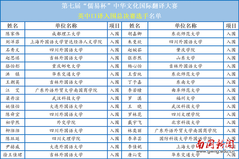 第七届“儒易杯”中华文化国际翻译大赛口译总决赛入围名单