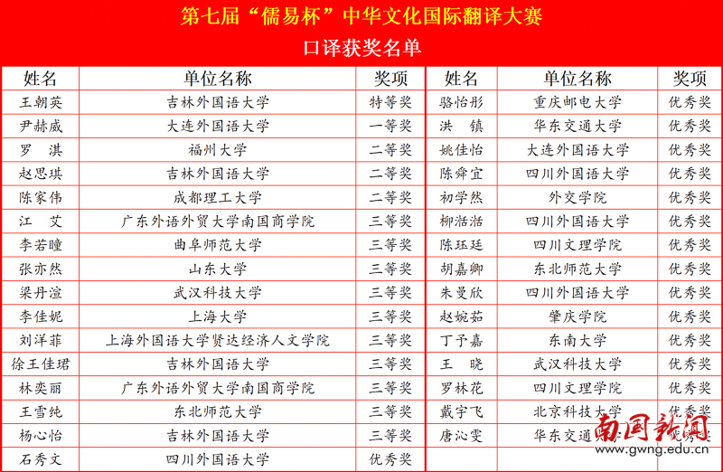第七届“儒易杯”中华文化国际翻译大赛口译总决赛获奖名单