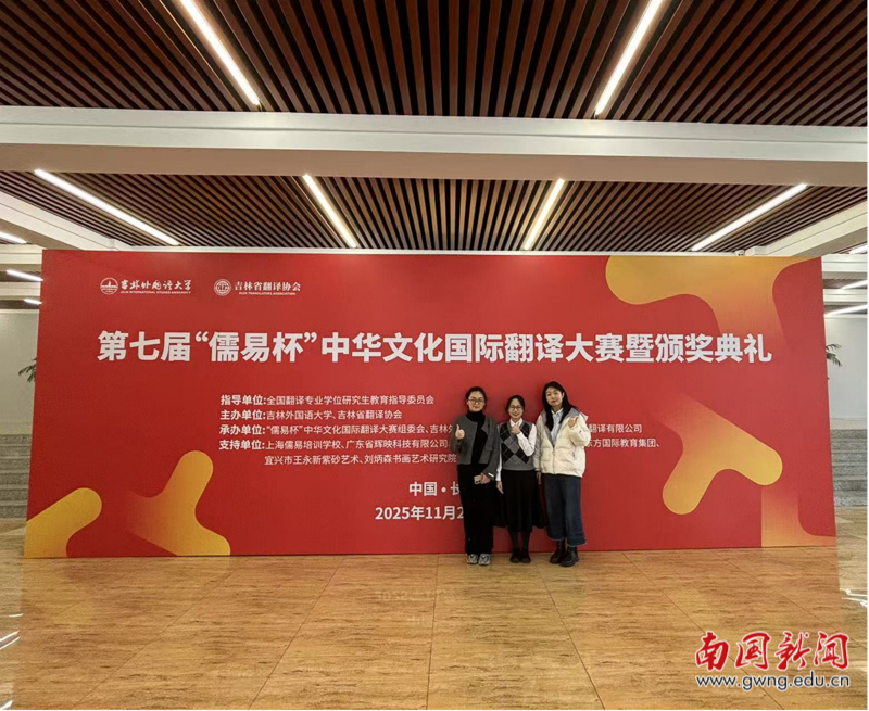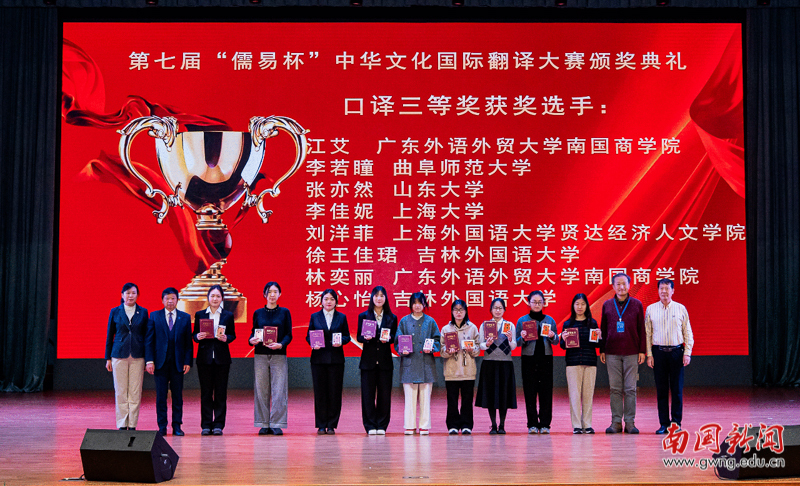 本网讯 11月30日,第七届“儒易杯”中华文化国际翻译大赛口译总决赛暨颁奖典礼在吉林外国语大学圆满落幕。我院2022级英语(语言文化)1班林奕丽同学(带队兼指导老师:耿子琪)、2022级英语(师范)卓越班江艾同学(带队兼指导老师:耿子琪)经过两轮激烈比拼,凭借扎实的专业功底和出色的临场表现,分别以总分第十三名和第六名的优异成绩,双双荣获全国口译组三等奖。