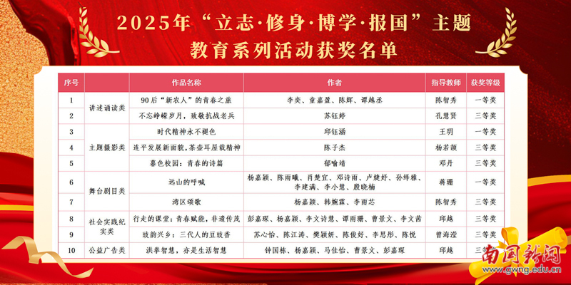 本网讯 近日,广东省教育厅公布了2025年“立志·修身·博学·报国”主题教育活动评选结果,我校共斩获10个奖项,其中一等奖3项、三等奖7项。