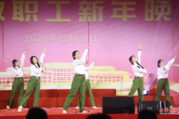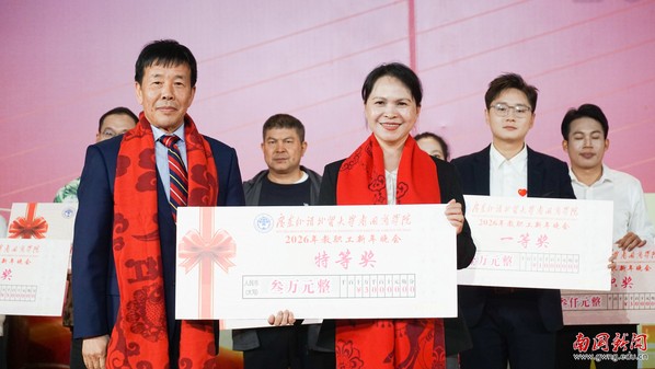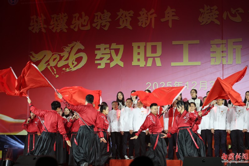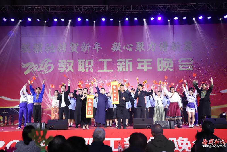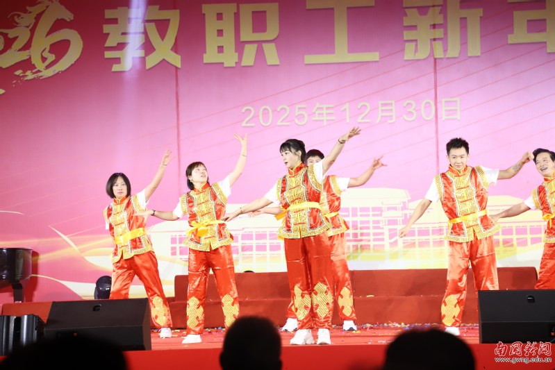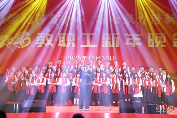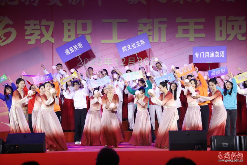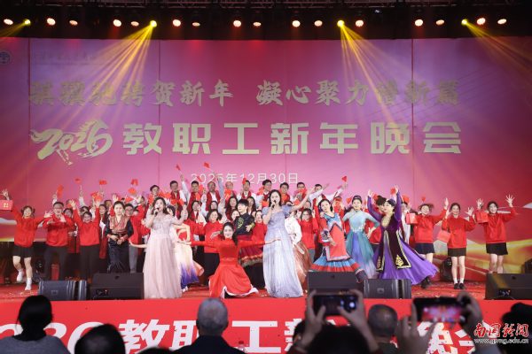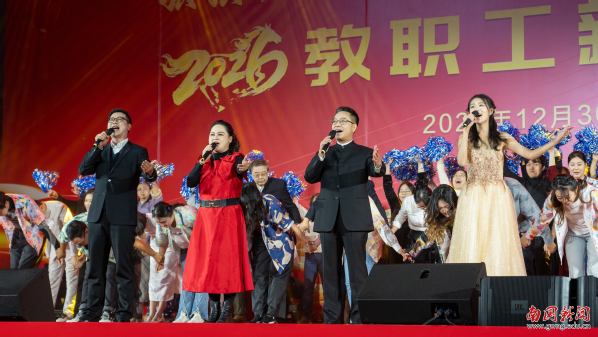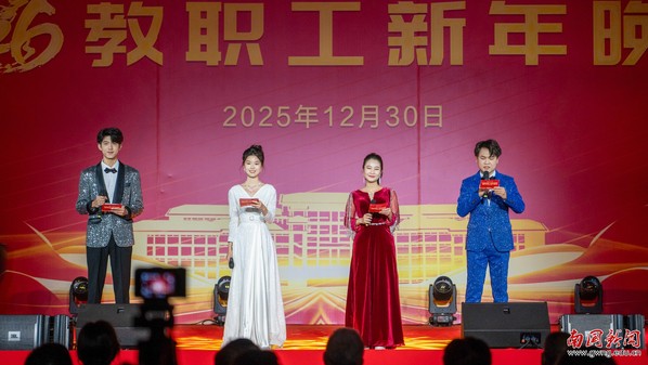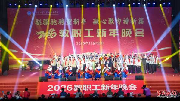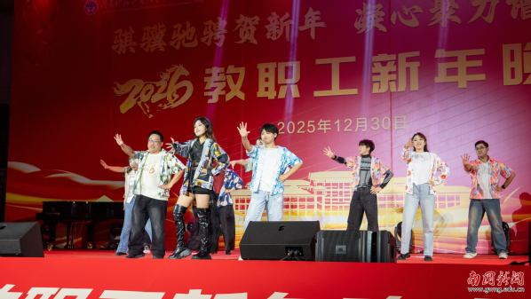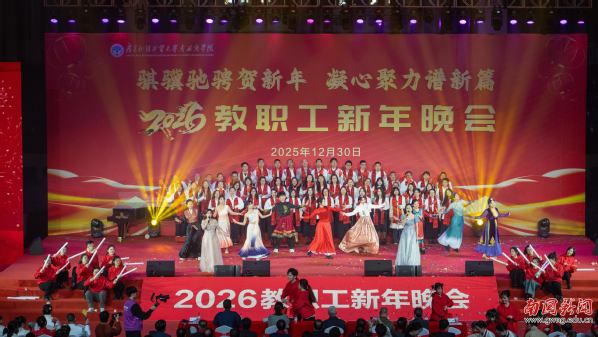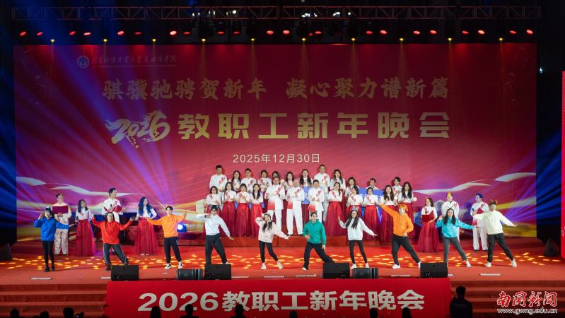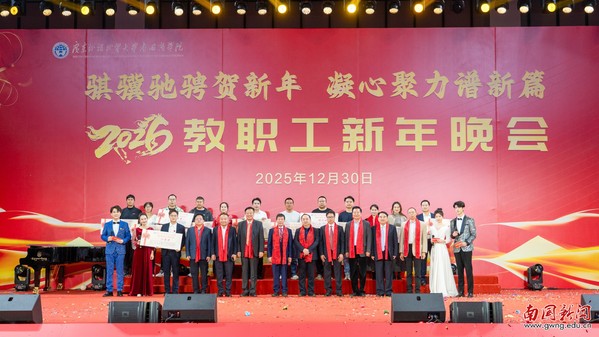 本网讯 12月30日晚,广东外语外贸大学南国商学院2026年教职工新年晚会在学校体育馆举行。学校领导与全体教职工欢聚一堂,喜迎新年,展望未来。机关工会凭借精心编排的歌舞《唱响中国年》,将晚会特等奖第三次收入囊中,实现“三连冠”。整场晚会以“骐骥驰骋贺新年 凝心聚力谱新篇”为主题,学校各工会组成15支队伍轮番登场,各展风采,呈现了一场精彩纷呈的才艺盛宴。在欢声笑语中,全体教职工共同表达了对即将到来的建校30周年的美好祝愿。
