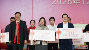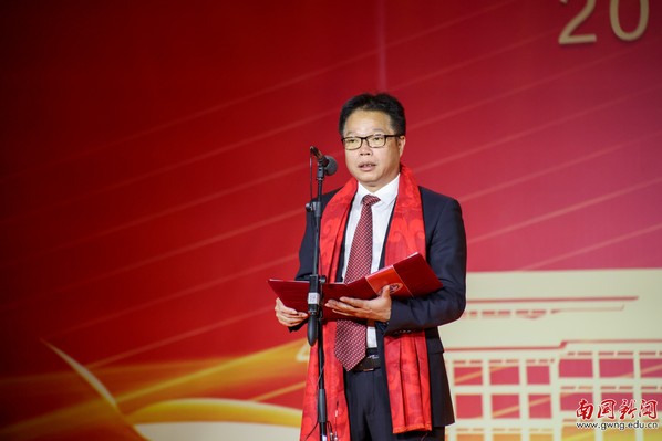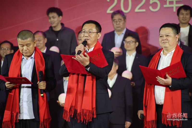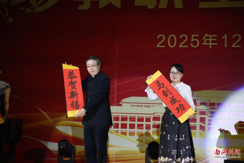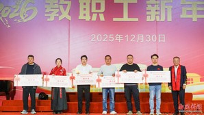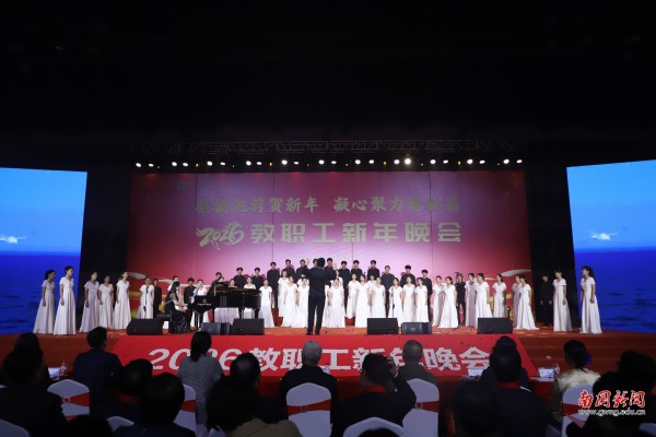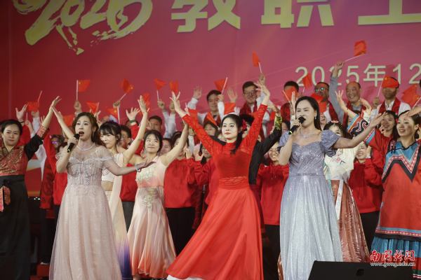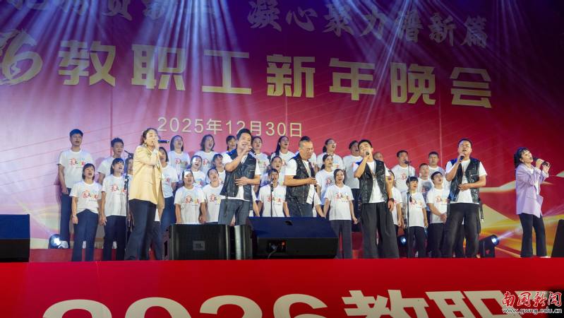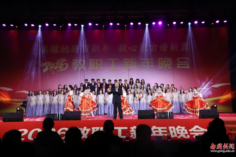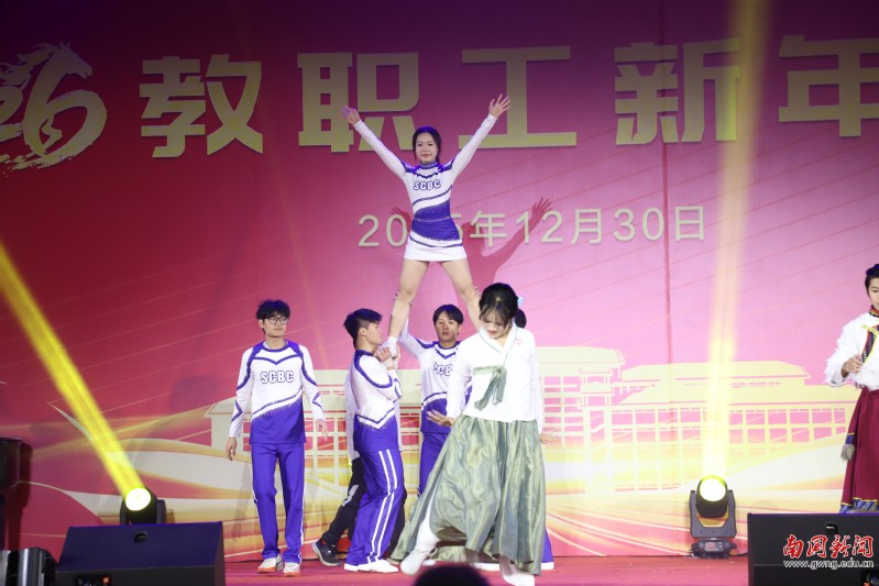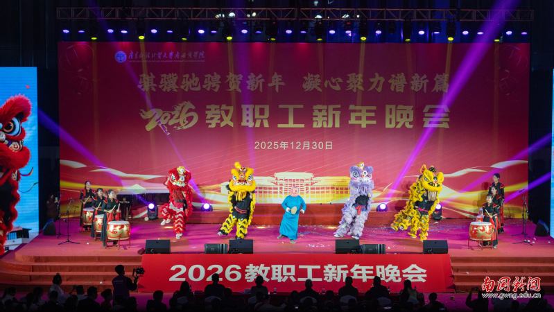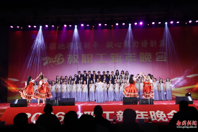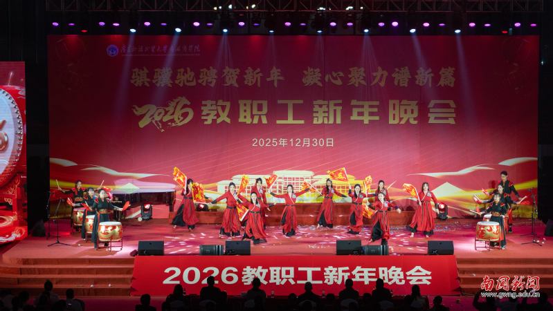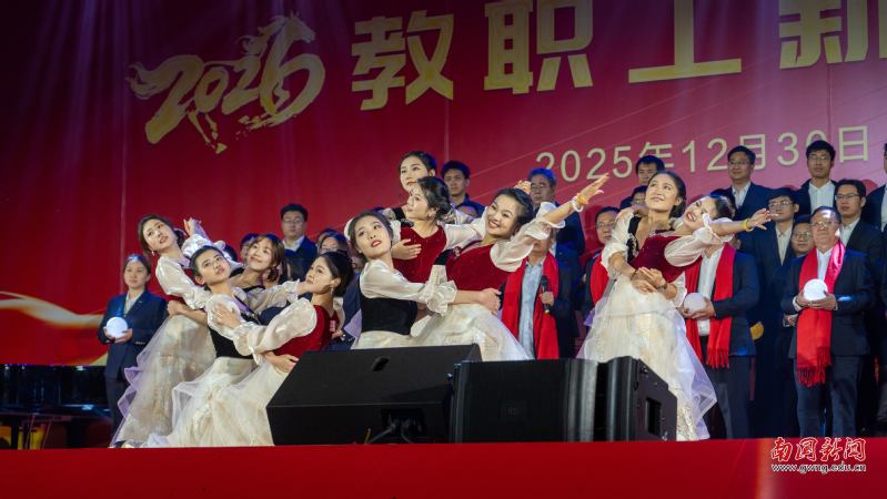 本网讯 12月30日晚,广东外语外贸大学南国商学院2026年教职工新年晚会在学校体育馆举行。学校领导与全体教职工欢聚一堂,喜迎新年,展望未来。机关工会凭借精心编排的歌舞《唱响中国年》,将晚会特等奖第三次收入囊中,实现“三连冠”。整场晚会以“骐骥驰骋贺新年 凝心聚力谱新篇”为主题,学校各工会组成15支队伍轮番登场,各展风采,呈现了一场精彩纷呈的才艺盛宴。在欢声笑语中,全体教职工共同表达了对即将到来的建校30周年的美好祝愿。