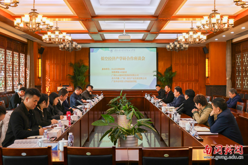 本网讯 1月6日,白云区委统战部常务副部长龙飞一行莅临我校,出席“低空经济产学研合作座谈会”。本次座谈聚焦低空经济的前沿研究与项目落地,汇聚政府、高校与企业多方力量,围绕技术应用、人才培养、平台建设及商业模式等核心议题深入交流,旨在构建“政产学研用”一体化协同创新体系,为服务粤港澳大湾区低空经济高质量发展奠定坚实基础。