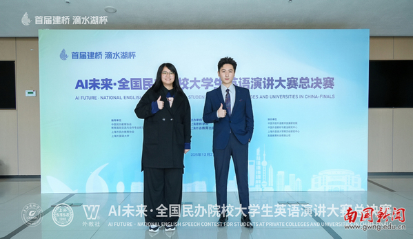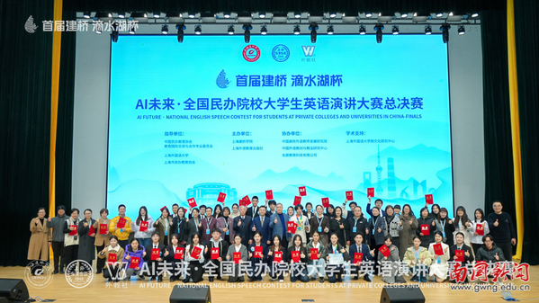 本网讯 2025年12月26日至28日,首届“滴水湖杯”AI未来·全国民办院校大学生英语演讲大赛总决赛在上海建桥学院举行。我校英文学院2025级英语(专升本)3班卢星宇同学指导老师:巢佳玉王菁晋级全国总决赛,与全国18个省份80余所民办高校的29名优秀选手同台竞技,最终荣获全国总决赛一等奖。