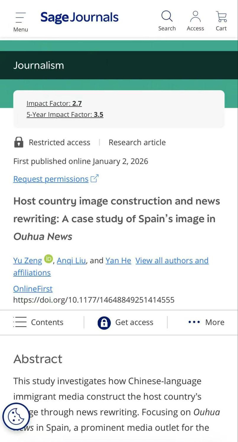 本网讯 1月2日,西语学院曾宇博士在国际权威学术期刊Journalism发表题为“Host Country Image Construction and News Rewriting: A Case Study of Spain’s Image in Ouhua News”的研究论文。Journalism 是新闻传播学领域的重要期刊,2025年影响因子为2.7,近五年影响因子为3.5。