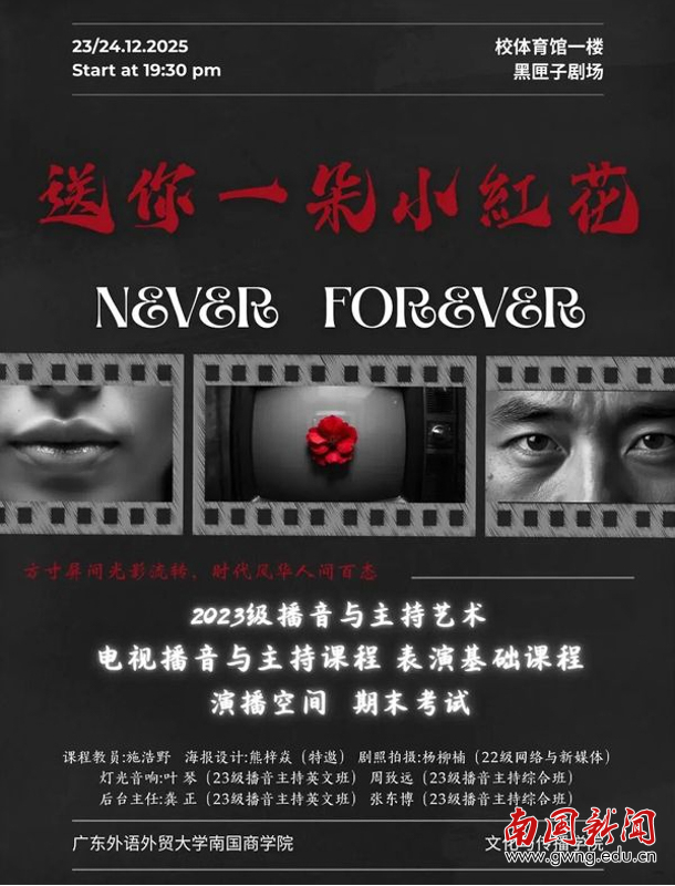 播音与主持艺术专业的展区,以丰富多样的成果展现形式引人驻足:《买买买战队》的直播实战、《平安有你,一路安心》的短视频创作、《送你一朵小红花》的舞台展演,一系列形式丰富的实践成果集中亮相。这些成果的背后,是该专业立足电视播音、节目主持与表演基础的课程体系开展教学实践的有力支撑,不仅全面锤炼了学生镜头前的吐字归音功底、舞台上的临场应变能力以及短视频创作中的创意表达水平,更生动诠释了“编播演一体” 的综合传媒素养。相关作品在全国大学生广告艺术大赛等赛事中更是屡获佳绩。此外,2023 级播音与主持艺术专业教学成果展演《送你一朵小红花》此前已圆满落幕,学子们用两天的精彩演绎,为这场 “传统与创新的传媒之约” 画上了圆满句号。