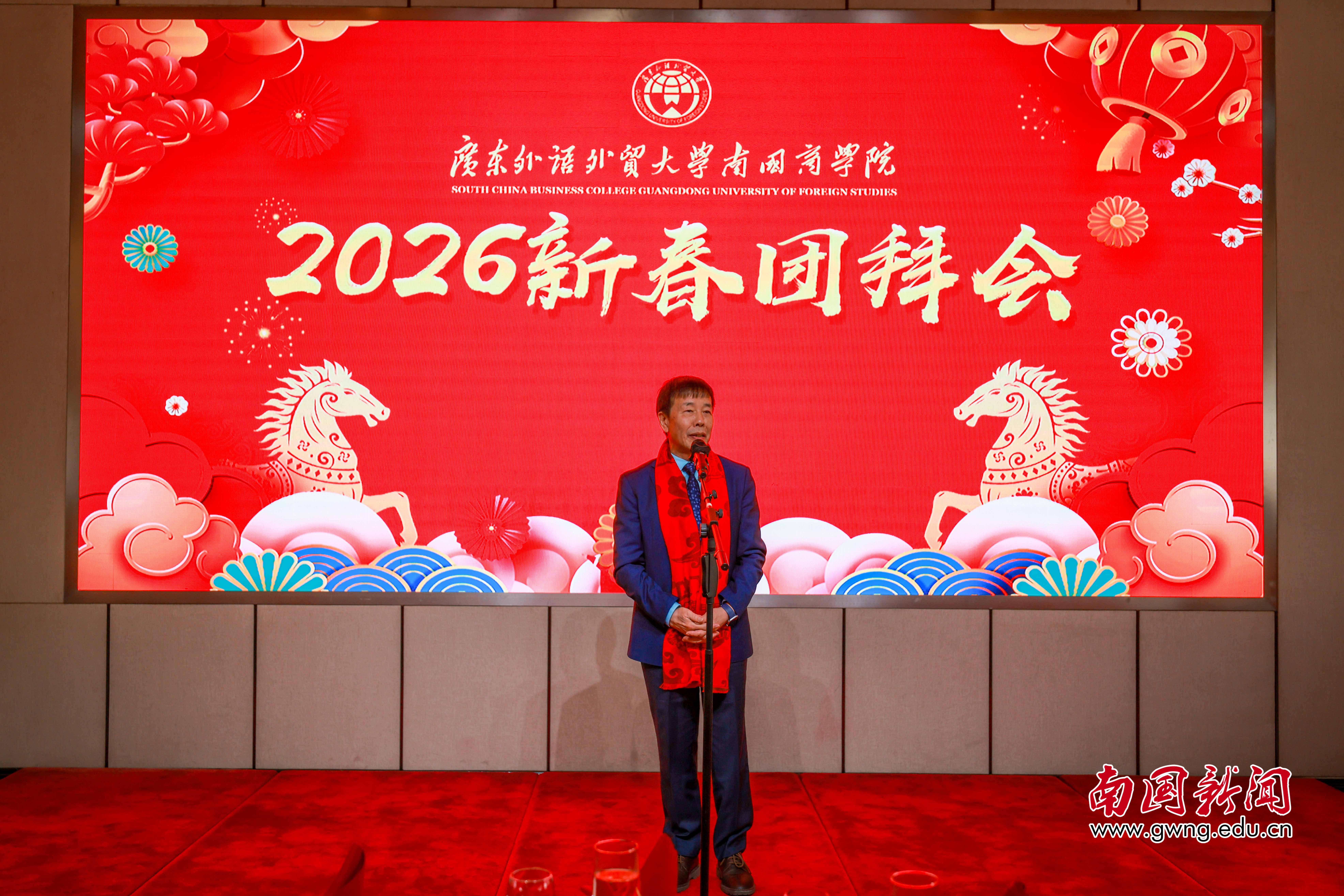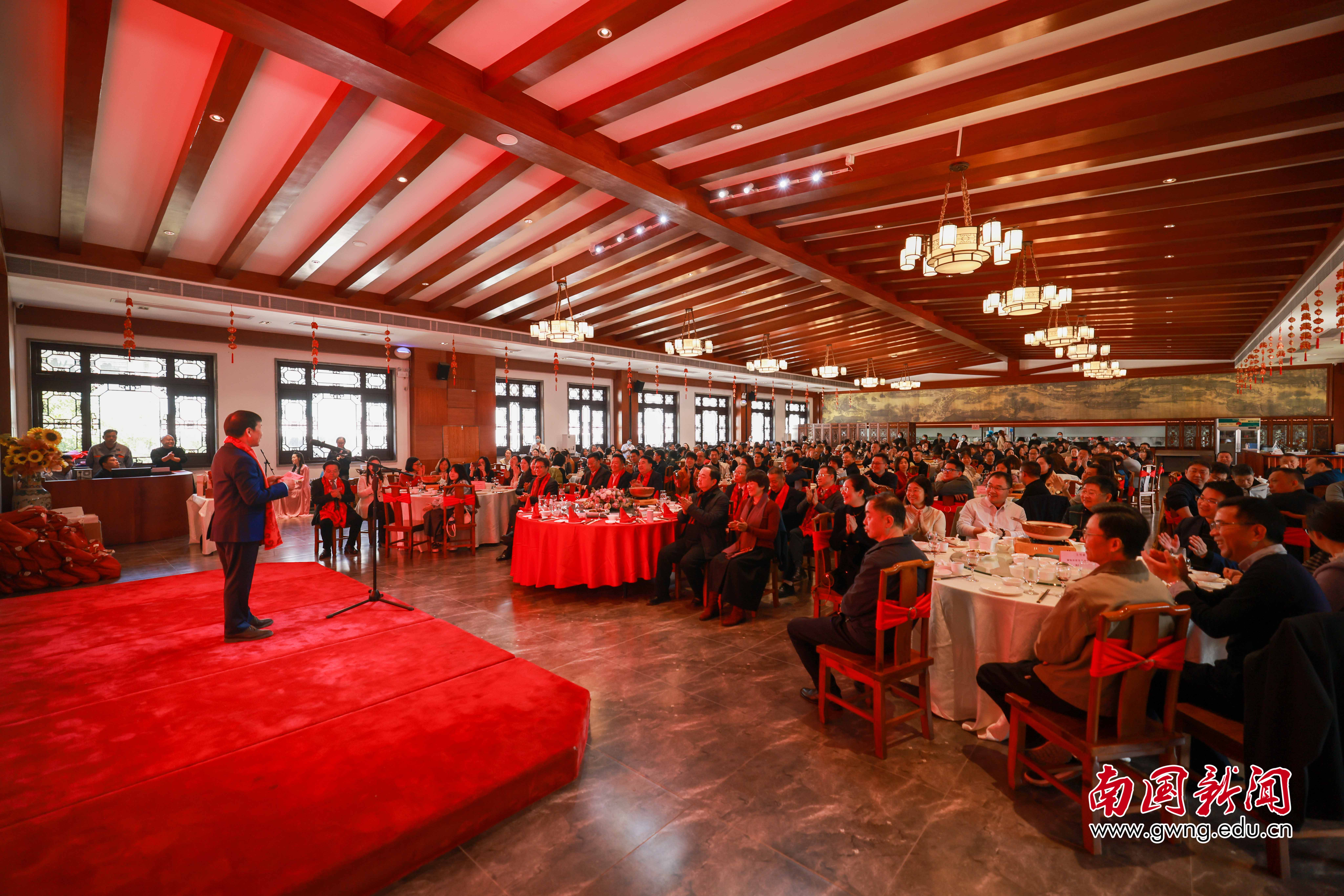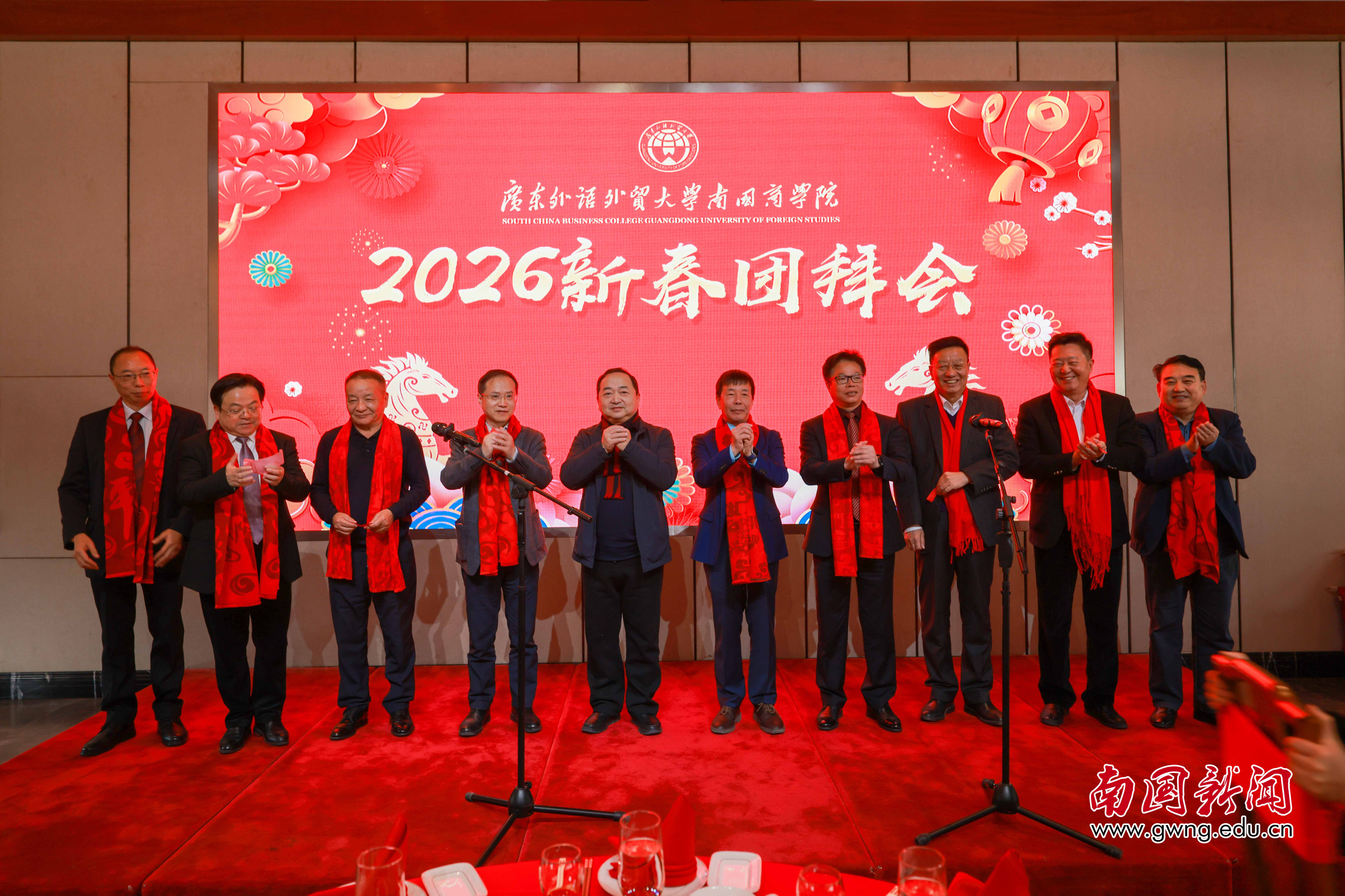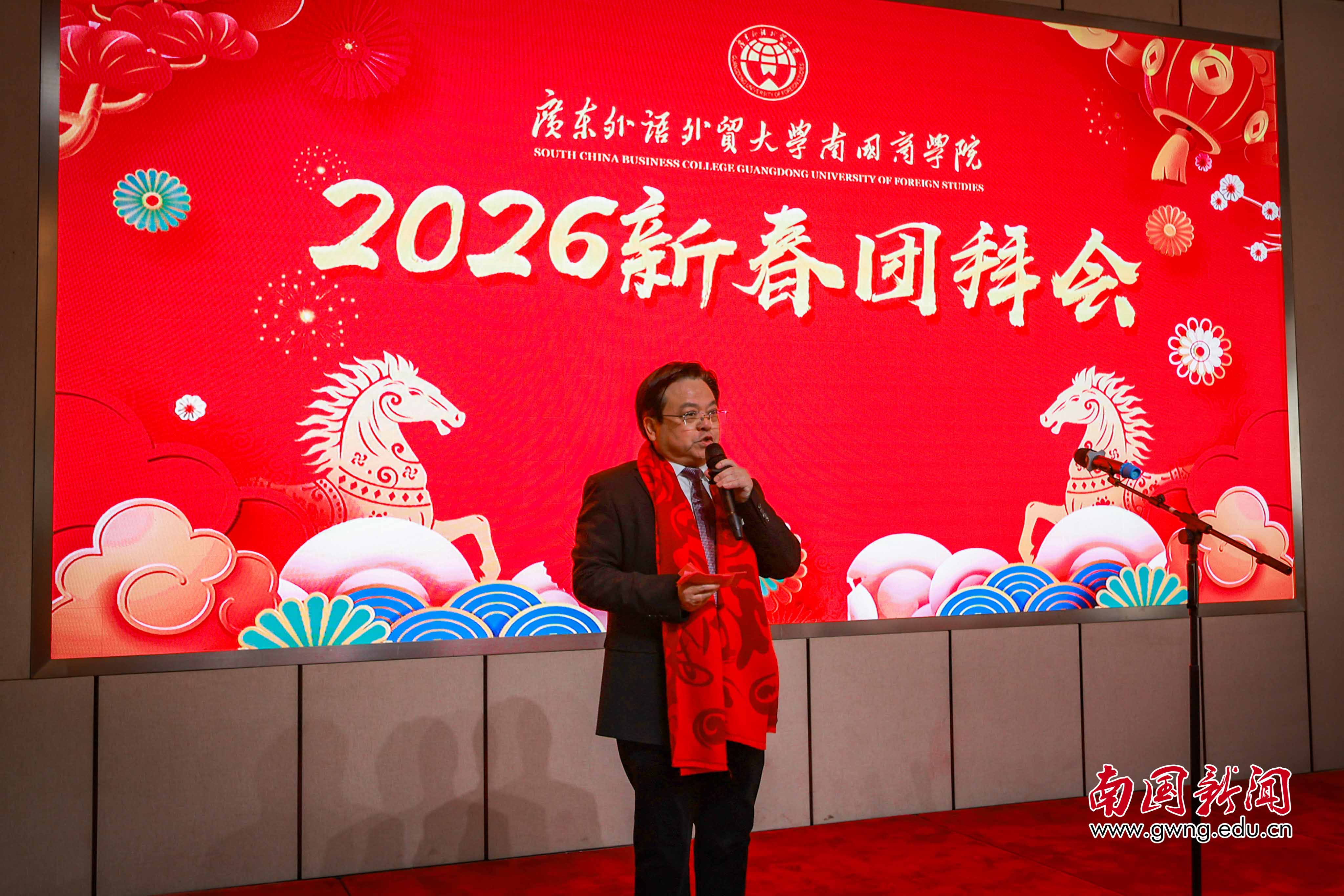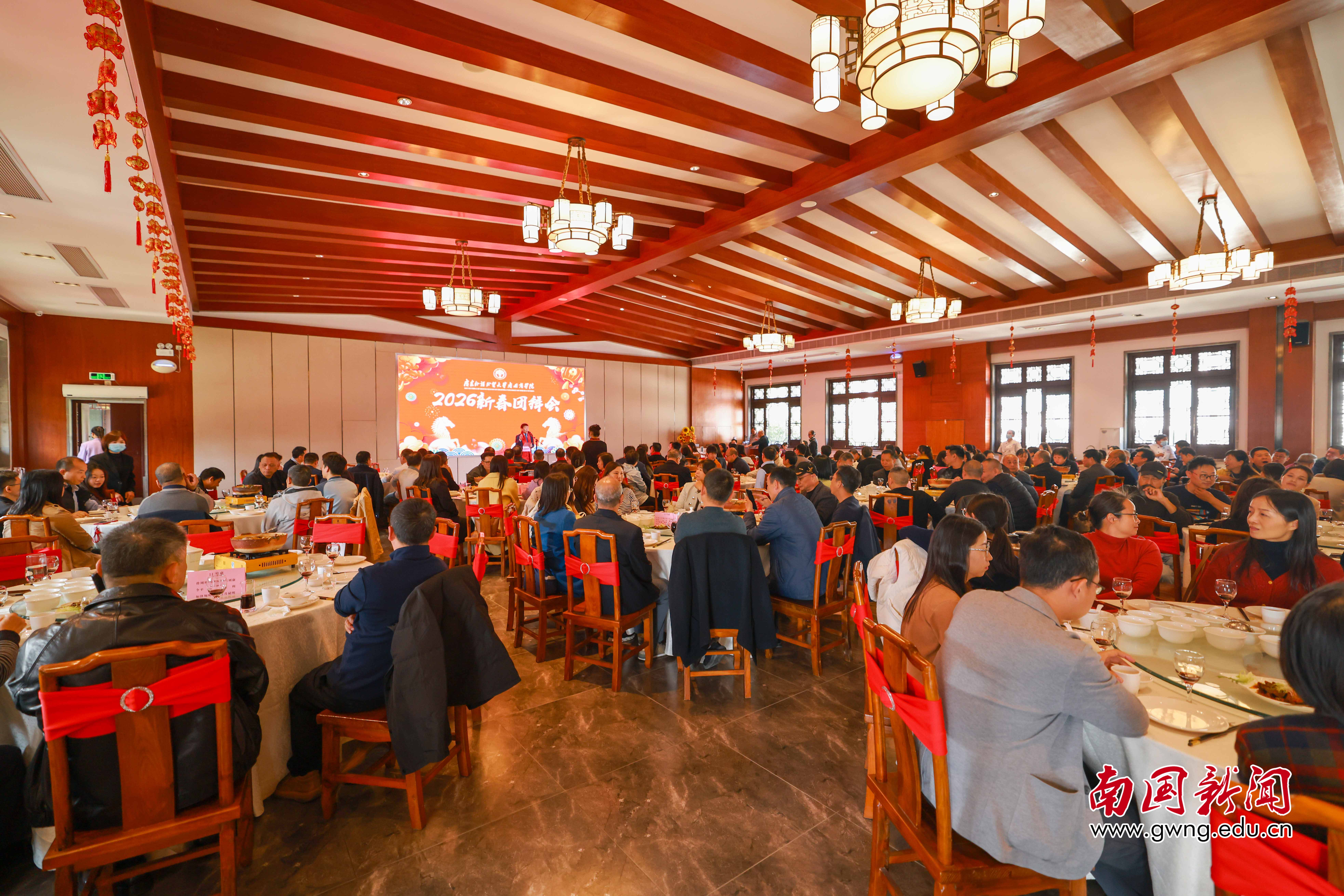 本网讯 1月12日中午,我校2026年新春团拜会在四楼中餐厅举行,学校领导,各学院、各部门副科以上干部,学科带头人、专业负责人,教学系(教研室)以及科研平台负责人欢聚一堂,共贺新春。王华校长在致辞中以“酿酒”为喻,将学校在“十四五”期间的发展硕果,比作一坛精心酿造、历经五载窖藏的“南国春秋”佳酿,他赞誉全体教职工是成就这坛美酒的“首席调酒师”。团拜会由赖志立副校长主持。