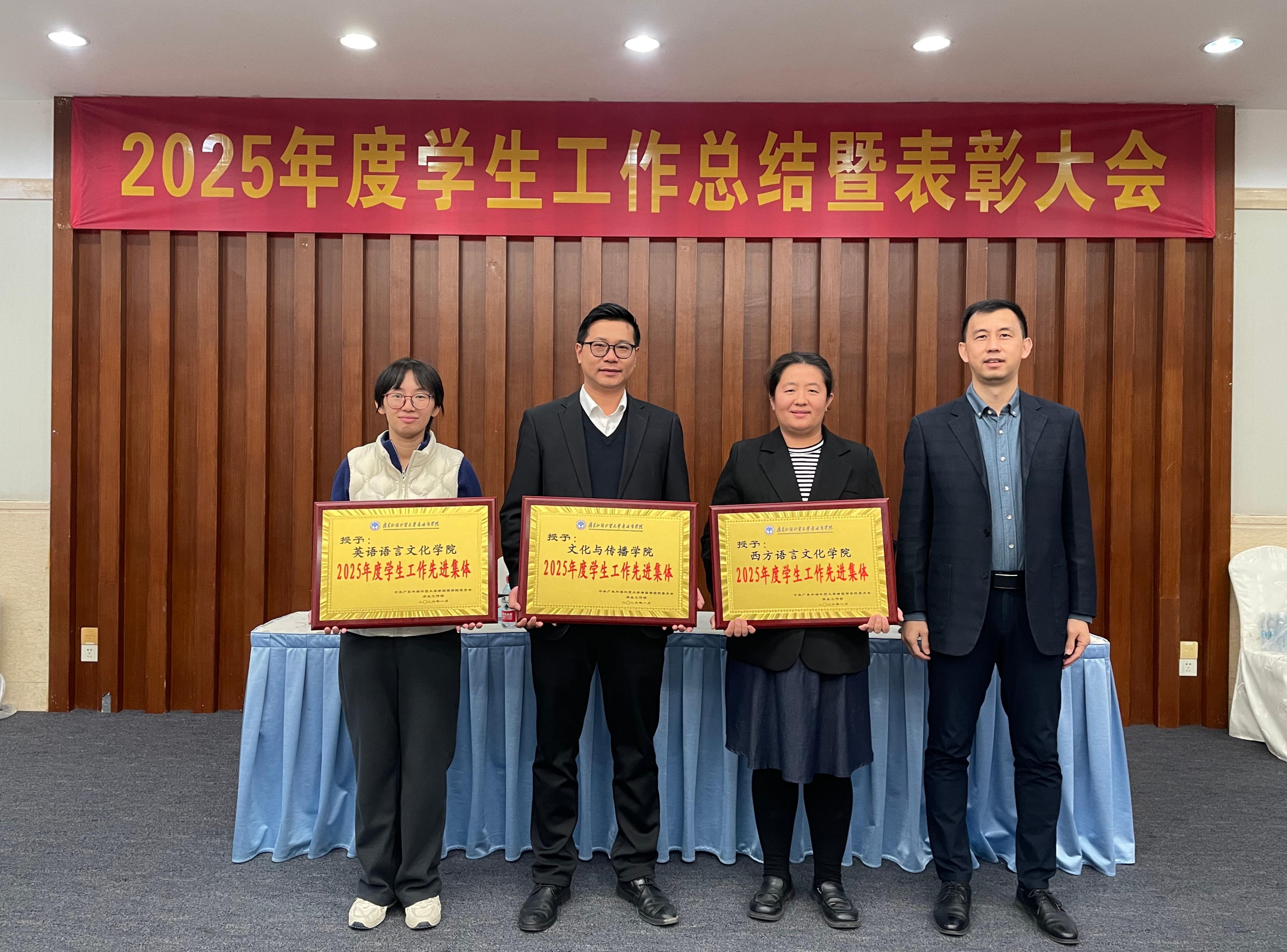 英语语言文化学院、西方语言文化学院、文化与传播学院获“学生工作先进集体”荣誉称号;英语语言文化学院、西方语言文化学院、管理学院获“学风建设先进集体”荣誉称号。西方语言文化学院高彩云、文化与传播学院黄泳茵、计算机学院范悦、校团委黄彦虹四位老师获“学生工作科研先进个人”荣誉称号。