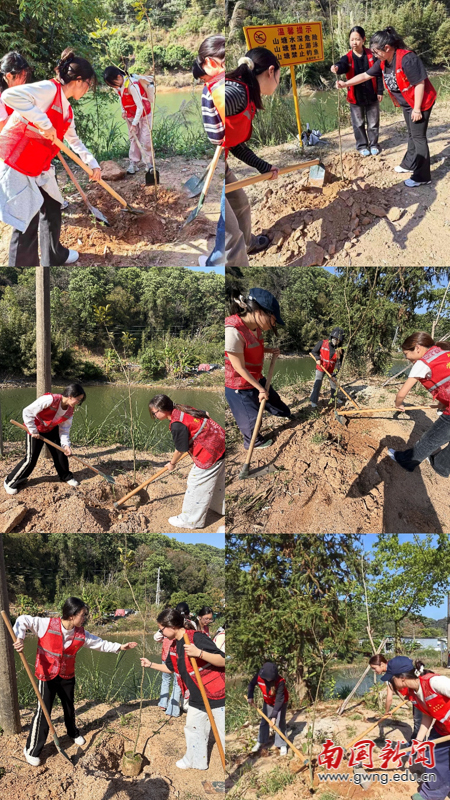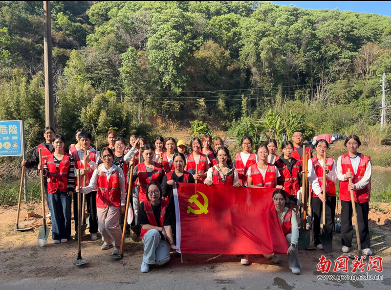 本网讯 春回大地,万物生辉;植绿护绿,正当其时。为深入践行习近平生态文明思想,坚定不移走生态优先、绿色发展之路,3月12日植树节当天,英文学院第二党支部携手金盆村党员突击队,共同开展“党旗领航,绿美同行”主题党日活动。党员们以实际行动播撒绿色希望,为乡村大地披上生态新装,让鲜红党旗在绿水青山间高高飘扬。