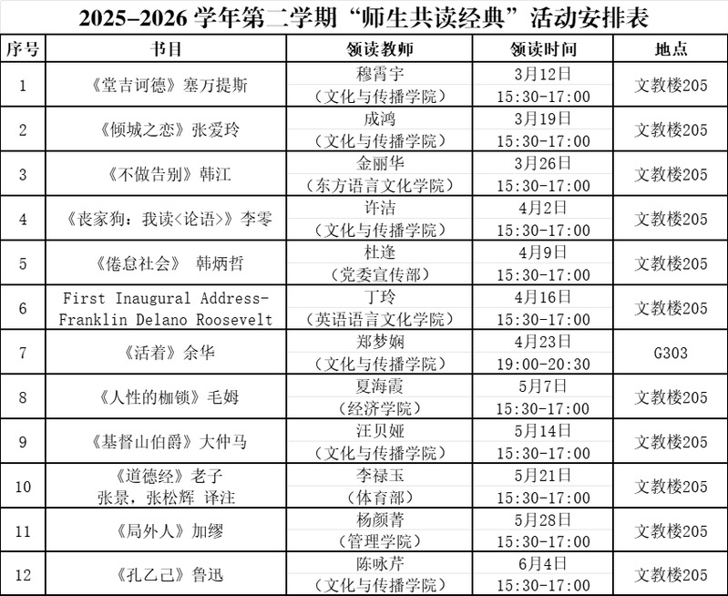 图书馆2025-2026学年第二学期“师生共读经典”活动安排表