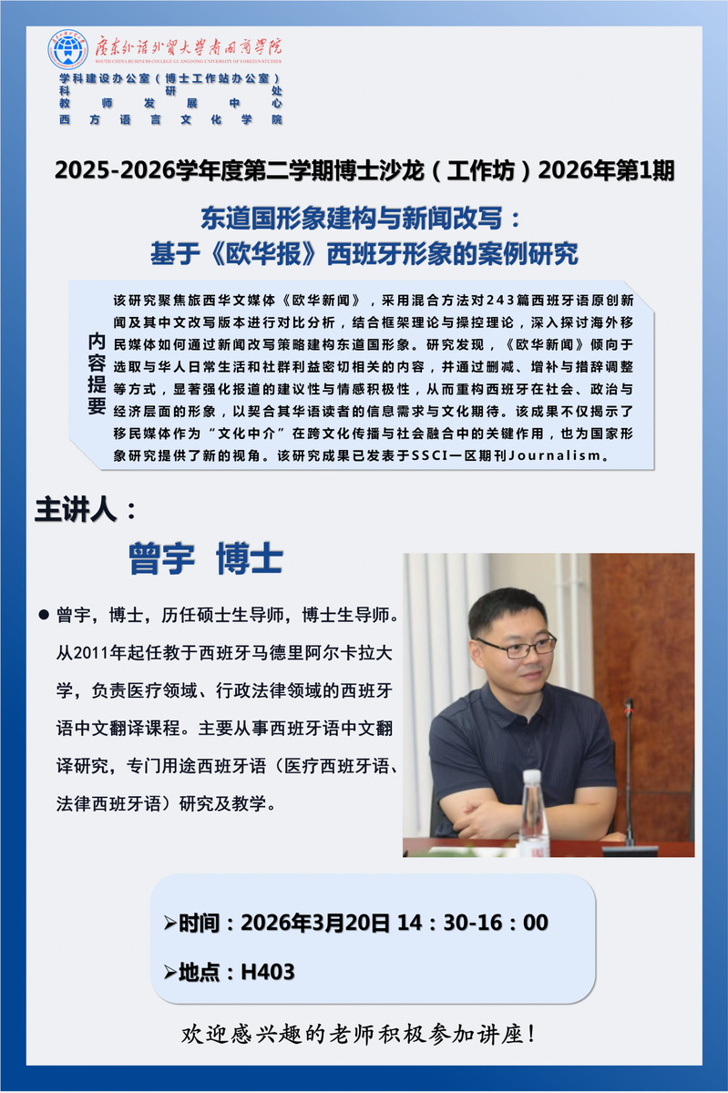 讲座内容简介:东道国形象建构与新闻改写:基于《欧华报》西班牙形象的案例研究