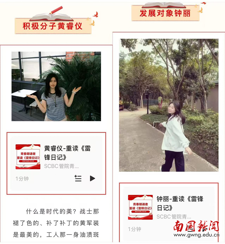 本网讯 为深入学习贯彻雷锋精神,不断创新学习形式,让雷锋精神真正走进同志们的内心、融入日常实践、扎根校园建设,管理学院第三党支部组织开展“读青春朗诵者-重读《雷锋日记》”特色主题活动。支部全体成员踊跃参与、全心投入,以深情诵读传递信仰力量,以静心感悟汲取榜样精神,在品读经典、锤炼思想的过程中,引导同志们立足校园为南国高质量发展添砖加瓦。